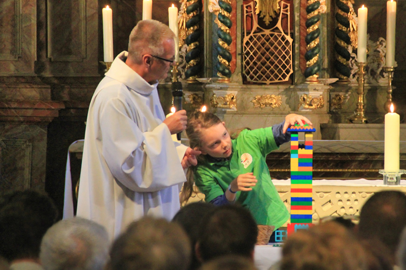 Und das taten die neuen "Worthis" dann auch: Sie bauten den Turm weiter und stellten fest: Da fehlt ja das Dach! Natürlich hatten die Viertklässler das nicht vergessen. Der Turm bekam sein Dach - und auch das hatte eine Bedeutung: Es stand für den Segen Gottes, der die Neuen und die Alten begleiten möge. Das sagten Schulleiterin Sandra Keiber und Gemeindereferent Marco Koch jedem Kind in einem persönlichen Segen zu.
